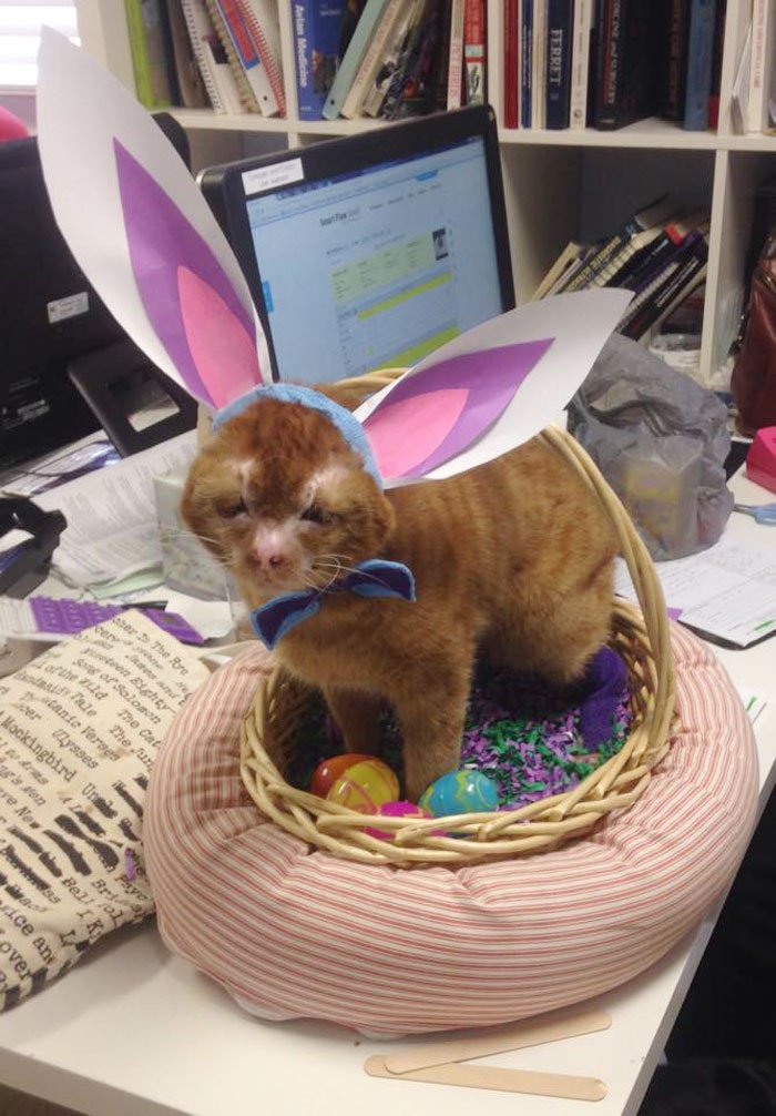 Voici Russel, comme vous pouvez le voir, ce pauvre chat a subi un grand traumatisme : il a survécu à l’incendie d’une maison malgré des brûlures aux troisième degré et après avoir été amputé. Malgré tout ça, sa force de vivre et sa compassion n’ont pas diminué.