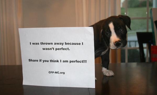C’est pourquoi, elle a partagé l’histoire de Captain Morgan sur la page Facebook de Cause of Paw accompagné d’une photo de lui. Sur la pancarte on peut lire « J’ai été rejeté parce que je n’étais pas parfait. Partagez cette photo si vous pensez que je suis parfait !!! »