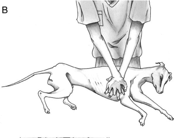 – Pour la plupart des chiens, les compressions peuvent être pratiquées sur la partie la plus large de la poitrine, tandis que le chien reste allongé sur le côté (Fig. A)
