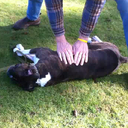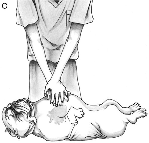 – Pour les chiens à poitrine en forme de fût (proéminente et ronde, type Bulldog) allongez le chien sur son dos et compressez sur le sternum (directement au-dessus du cœur) comme vous le feriez pour un être humain. (Fig. C)