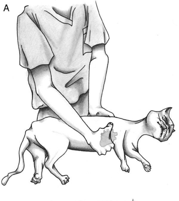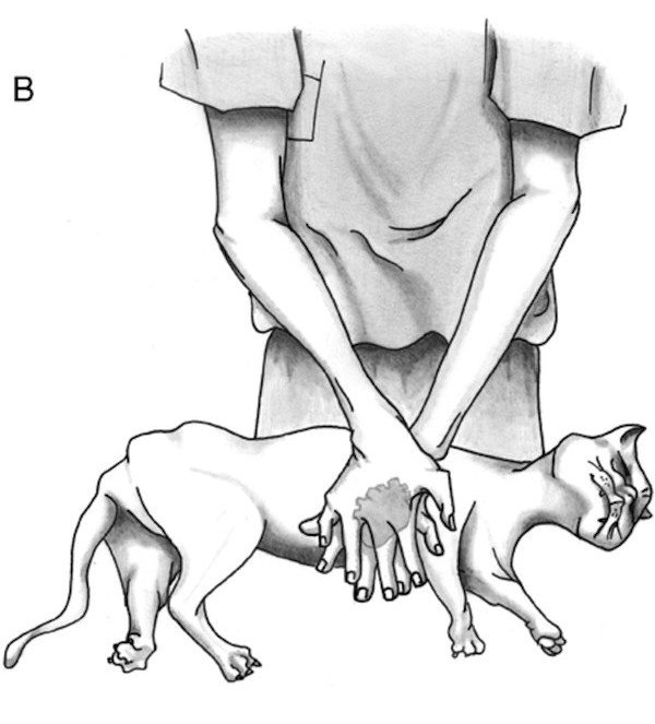 – Pour les chats, vous pouvez aussi opérer à deux mains en compressant sur les côtes. Vous pouvez choisir l’une ou l’autre de ces techniques de massage en fonction de la taille de l’animal. (Fig. B)