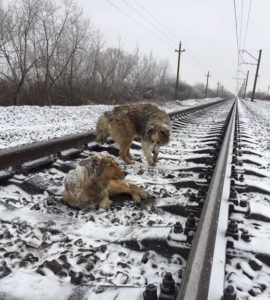 Voilà des images bien tristes, mais heureusement, tout rentre dans l’ordre au final. C’était le jour de Noël quand Denis Malafeyev a reçu un appel téléphonique d’un ami. Et pour cause, une chienne a été aperçue sur les rails d’un train en Ukraine. C’est un groupe de sauveteurs de la ville d’Uzhgorod qui sont venus lui porter secours. La chienne était en fait immobilisée sur les rails, car blessée. Elle n’arrivait même plus à se lever, ni même à bouger. Denis est aussitôt allé voir et après avoir tenté à de multiples reprises de faire bouger les chiens, ceux-ci refusaient de s’en aller des rails. Le chien valide défendait son amie et l’approche à été longue. À chaque fois que quelqu’un arrivait trop près, il aboyait pour les effrayer.