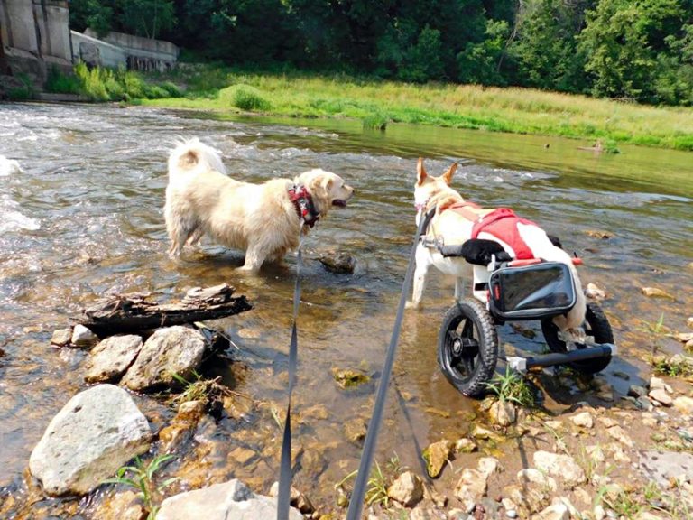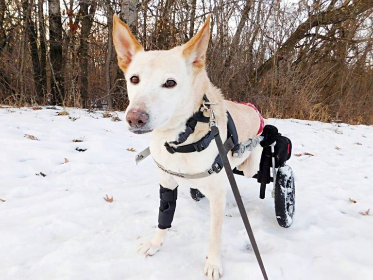 Chien paralysé retrouvé dans la rue avec un sac de couches et fauteuil roulant délabré