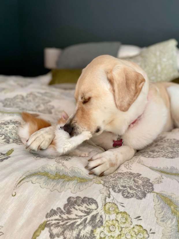 « L’épidémie de COVID-19 m’a également frappée et j’étais isolée à la maison », raconte Kendal Benken. « Je cherchais quelque chose à faire. Et qui n’aime pas les petits chatons mignons ? Je l’ai vu comme une grande opportunité ». Le refuge Jelly’s Place Animal Sanctuary à San Pablo, en Californie, a accepté qu’elle devienne la mère adoptive des chatons. Mais dès que Benken est rentrée chez elle avec les petits, il était clair que sa chienne, Truvy, voulait elle aussi jouer ce rôle. « C’était trop marrant. Quand je suis arrivée avec eux, elle m’a immédiatement dit : ‘Laisse-moi m’en occuper' », raconte Benken. La gentillesse du Labrador envers les chatons surprendra les gens qui croient au stéréotype selon lequel les chiens et les chats se détestent toujours.