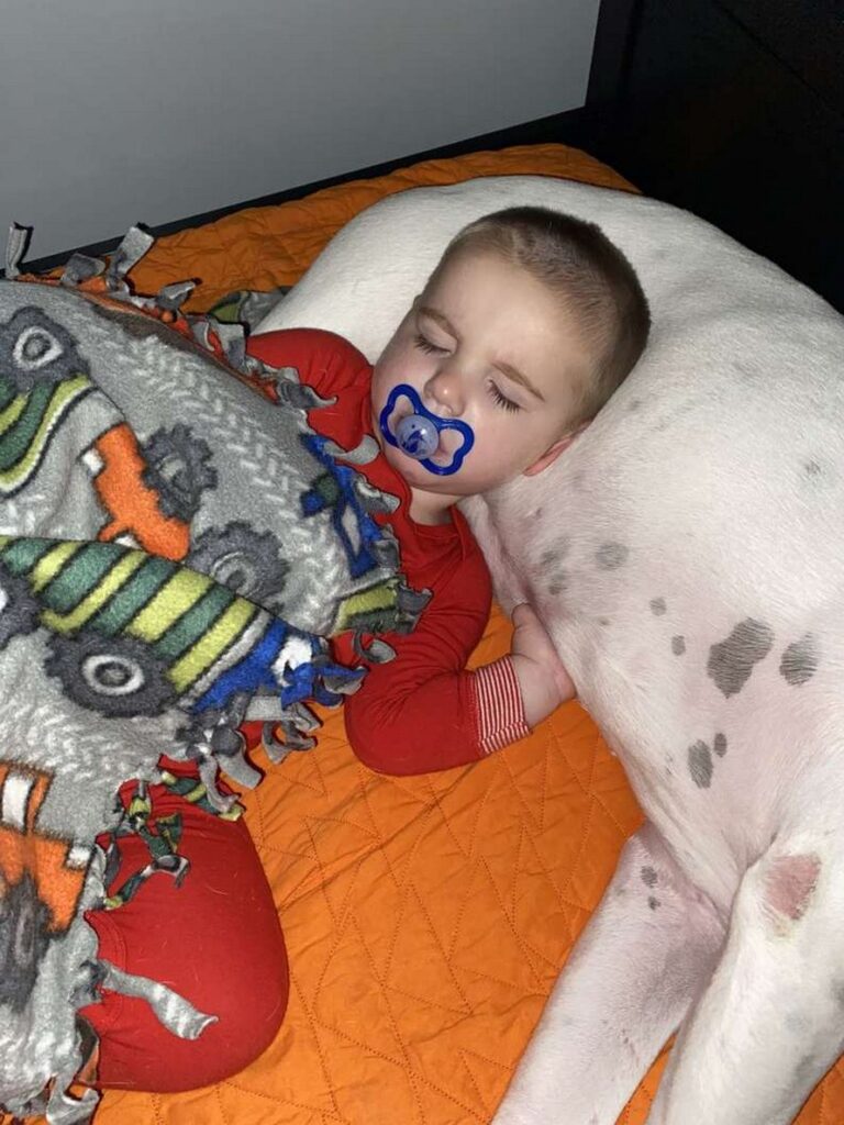 Après sept semaines et quelques complications, Finn a finalement pu rentrer chez lui. Et lorsque Brutus a rencontré son petit frère, ils sont immédiatement devenus amis. Le toutou a directement réservé un accueil chaleureux au petit garçon. « Quand nous sommes rentrés à la maison, c’était comme si Brutus savait que Finn avait besoin d’être surveillé de plus près, et il est resté à ses côtés depuis », a déclaré Knudtson. « Brutus se recroqueville souvent là où Finn est assis et le suit de pièce en pièce dans la maison », a déclaré Knudtson. « Si Finn est malade, Brutus le sait et reste à côté de Finn ou pose sa tête sur sa poitrine. » Quand Finn était bébé, le chien dormait sur le tapis devant le berceau. Désormais, Finn dort dans un lit sans barreaux. Une bonne occasion pour s’échapper la nuit et rejoindre son meilleur ami! « Finn a commencé à dormir dans son “lit de grand garçon” il y a un peu plus d’un mois, et c’est à ce moment-là que Brutus a commencé à ramper et à dormir dans le lit de Finn toutes les nuits », a déclaré Knudtson.