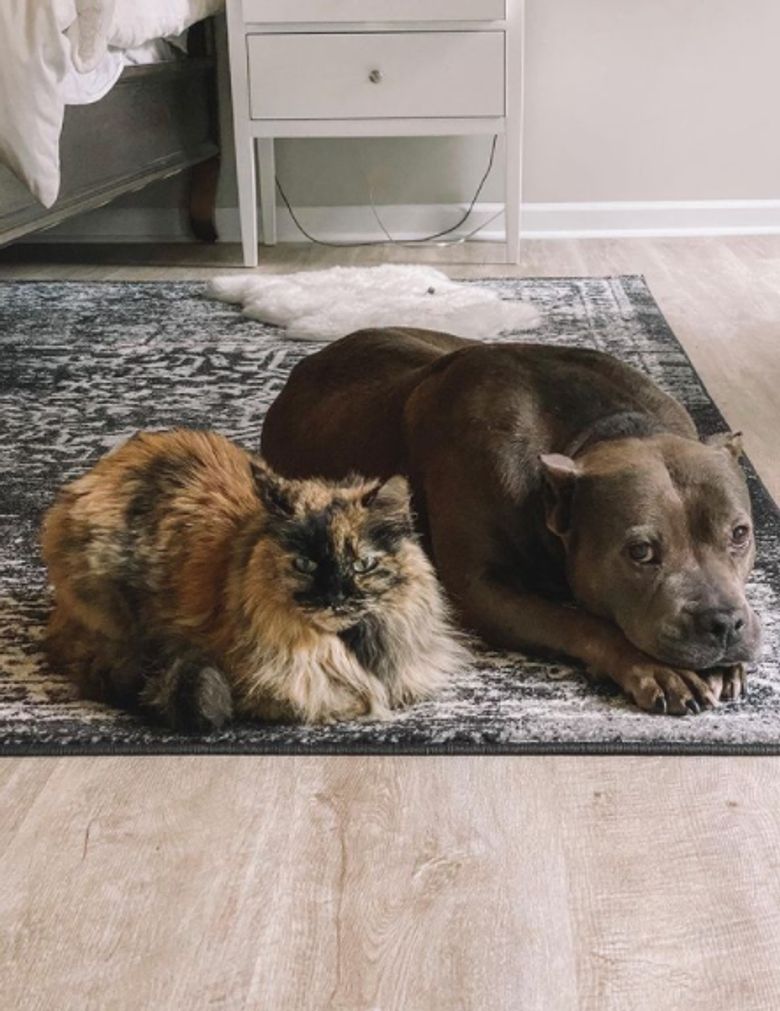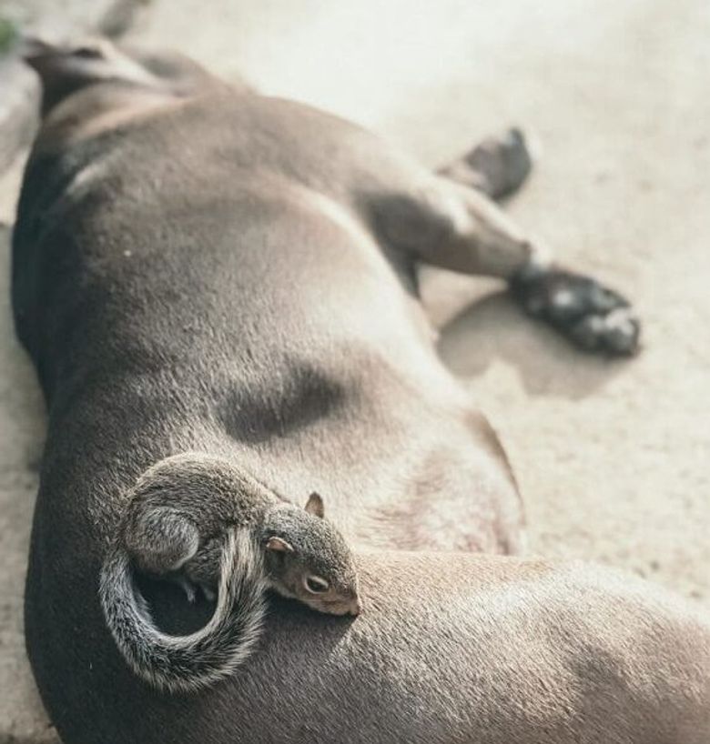 L’orphelin s’est immédiatement attaché au Pitbull et a décidé de le suivre. À la maison, le rongeur était bien déterminé à rester près d’Everly. L’écureuil ne voulait plus quitter le foyer. Pendant la sieste de cette dernière, il a grimpé naturellement sur son dos pour profiter de sa chaleur. Everly est, en quelque sorte, devenue la maman adoptive du jeune écureuil. Au fil des jours, la chienne a commencé à prendre son rôle très au sérieux. Tous les deux ont pris l’habitude de se blottir l’un contre l’autre et de faire leur sieste ensemble. Everly s’est même occupée de la toilette de son protégé. « Everly a un talent spécial de toujours se faire de nouveaux amis », a confié sa propriétaire. Même le chat du foyer a accepté le nouvel arrivant.