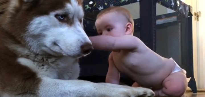 La réaction du chien est adorable (Vidéo) Dans cette vidéo, vous découvrirez un bébé qui tente de sympathiser avec le husky...