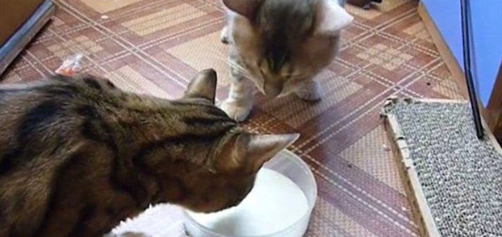 Voici un problème existentiel Deux chats se retrouvent confrontés à un problème existentiel: comment faire pour pouvoir boire son lait dans le...